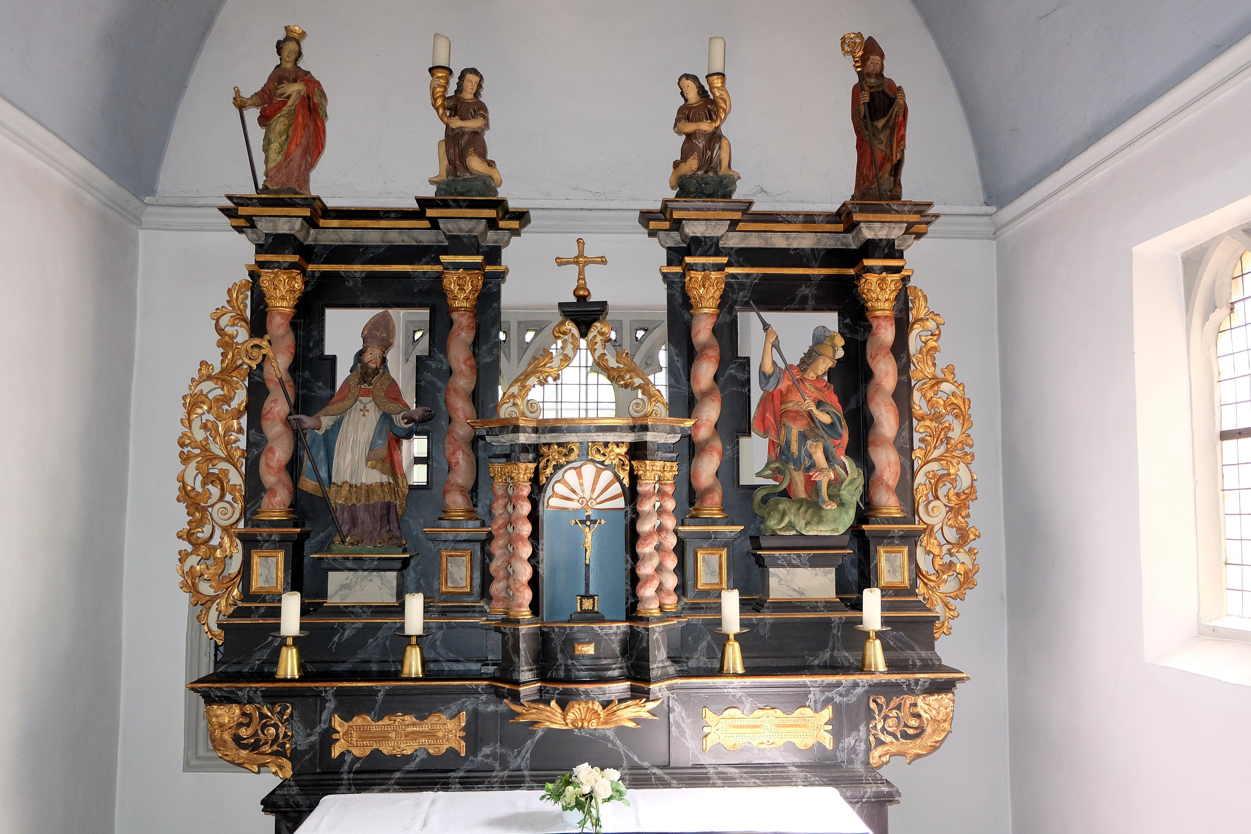 An das rechtwinklige, flachgedeckte Langhaus schließt sich der quadratische, mit einem hölzernen Tonnengewölbe versehene Chor an, die nördliche Sakristei ist 1699 angebaut worden.