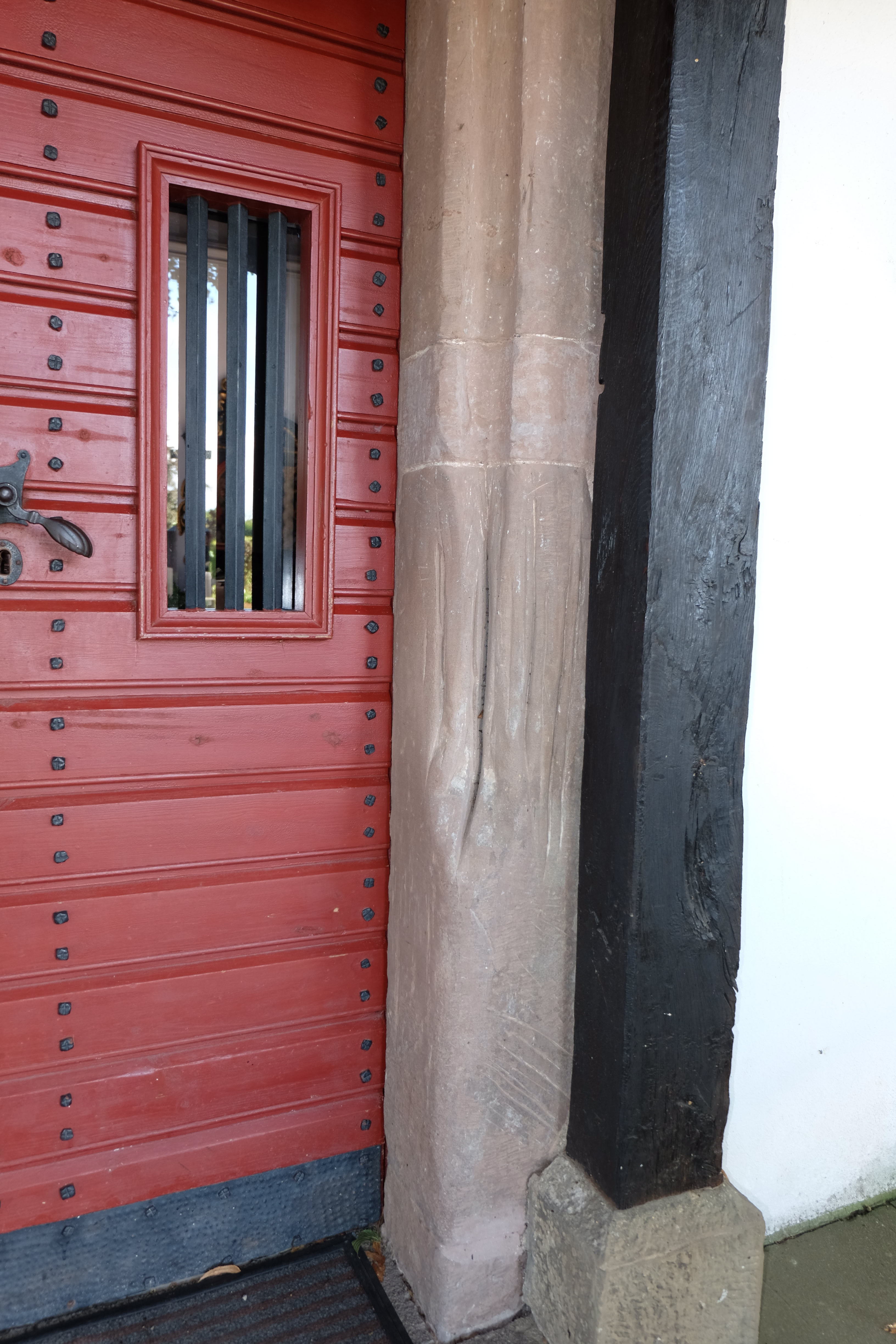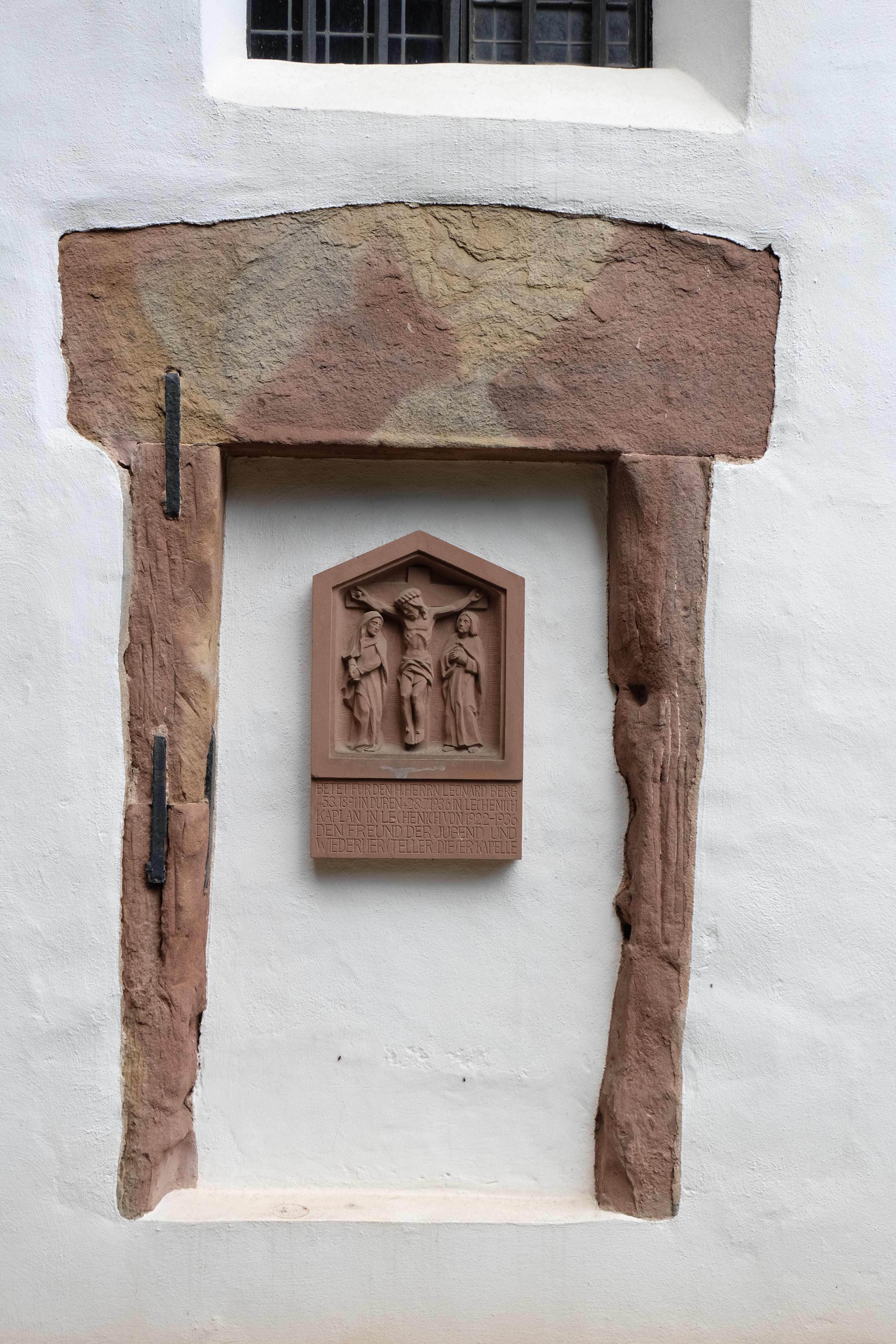 Das Material des Langhauses sind u. a. Grauwacke, Sandstein und römische Spolien, die zum Teil sichtbar sind. Das Material des Chores mit seinen spätgotischen Maßwerkfenstern ist Tuff und das der Sakristei Backstein. Das romanische Eingangsportal (Rotsandstein) mit dem mächtigen Türsturz an der Südseite sowie zwei ursprüngliche Fensteröffnungen an der Nord- und Südseite haben sich erhalten, sind heute jedoch verschlossen.