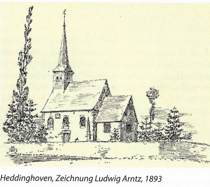 als Hofeskirche eines Fronhofes. Sie war eine Filialkirche der Lechenicher Pfarrkirche und mit ihr dem Kölner Stift St. Aposteln inkorporiert. Der Ortsname wird um 1155 das erste Mal urkundlich in einer Handschrift des Benediktinerklosters Deutz als ,Heddinchoven' erwähnt. 1343 stifteten die Eheleute Arnold und Idburg von Buschfeld der Kapelle zu Heddinghoven Güter und Einkünfte zur Unterhaltung eines Kaplans, der täglich die Messe lesen sollte. Zudem erklärte der Kölner Erzbischof Walram von Jülich (1332-1349) die Kapelle zum ,Benefizium', d. h. sie war fortan von allen Abgaben befreit.